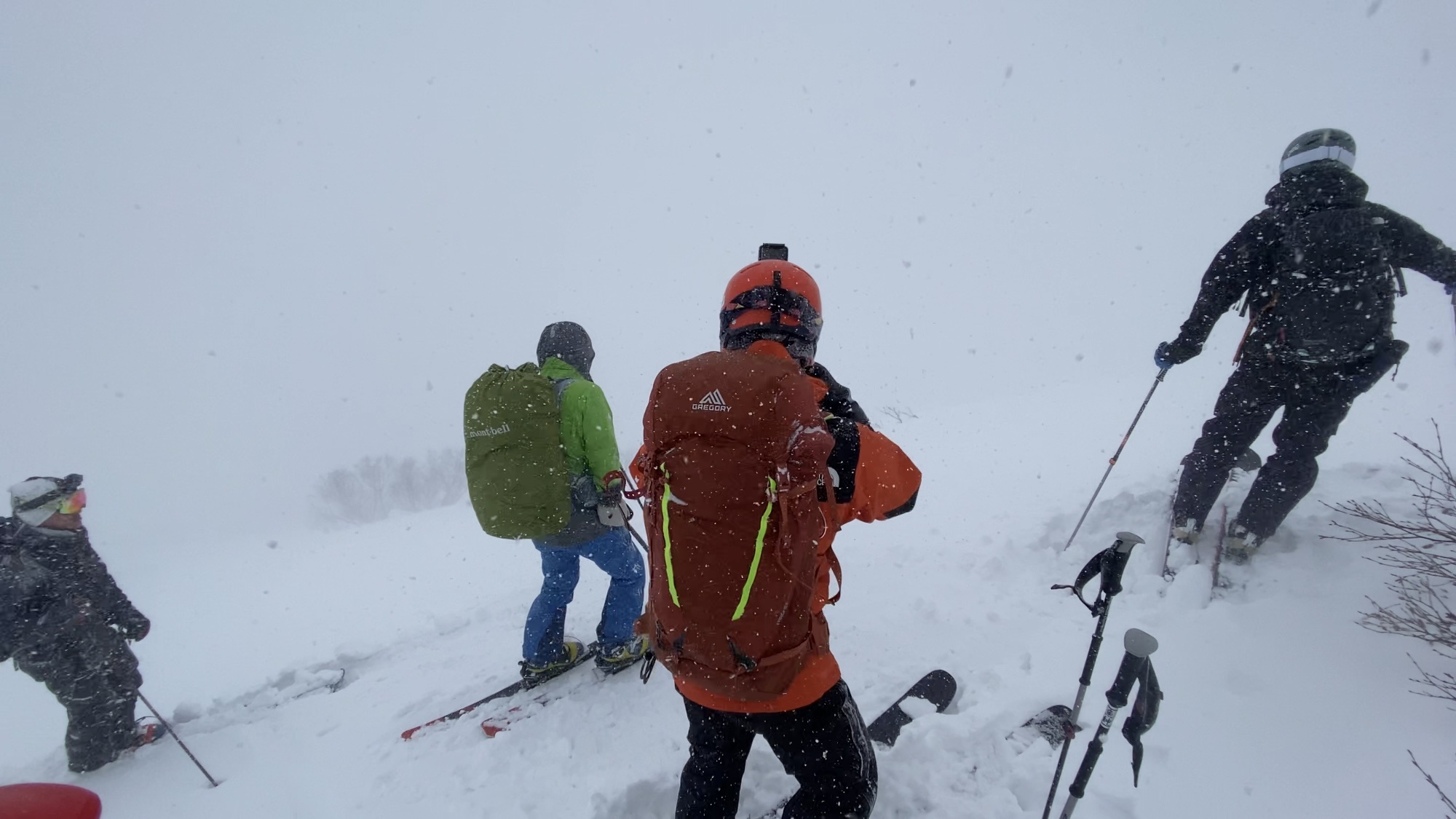 強風と吹雪の中を昨日登った地点までハイクアップ